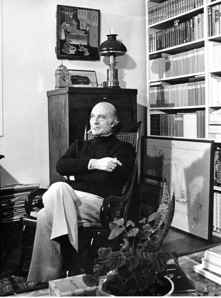 Το έργο του, απόλυτα συνυφασμένο με τη ζωή του. “Ναι, αγαπάω τ΄ αντικείμενά μου και ζω μαζί τους. Όταν ταξιδεύω, μου λείπουν. Τίποτε εδώ δεν είναι ακριβό ή πολύτιμο. Έχουν, όμως, όλα για μένα μια σημασία, συνδέονται με την ποίησή μου, τη ζωή μου, τα ταξίδια μου. Το μικρό τραπεζάκι στη γωνία προέρχεται από τ’ αρχοντικό του Διονυσίου Σολωμού. Εκείνο το ξυλόγλυπτο είναι από μπάντα καραβιού, ίσως από τέμπλο. Η λιθογραφία πλάι στο κρεβάτι μου, δώρο του Ματίς με ιδιόχειρη αφιέρωση”.
